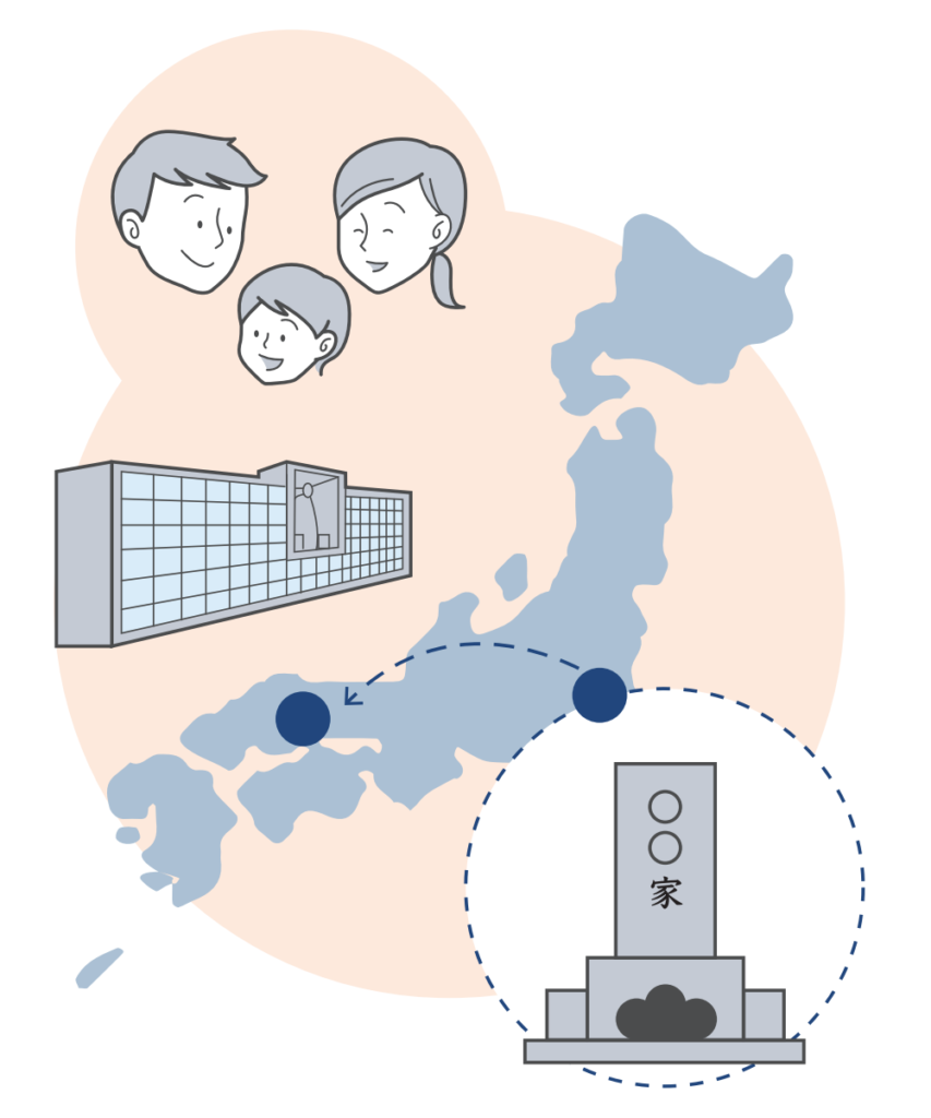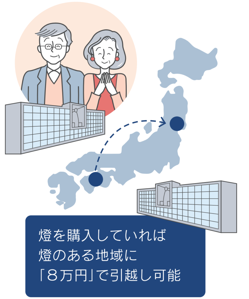 まずは自宅の近くで燈を購入。安心の永代供養が受けられます。その後、Aさんの没後はご主人のご遺骨とともにお子様が住む地域にお墓をお引っ越し。お子様は自宅の近くでお墓参りができます。